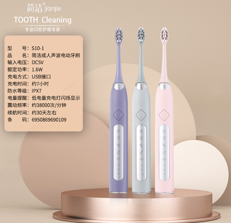 • 简洁智能声波电动牙刷JS10-1(配:一支主机+一只便携盒+三个刷头+三个刷套+一根数据线)